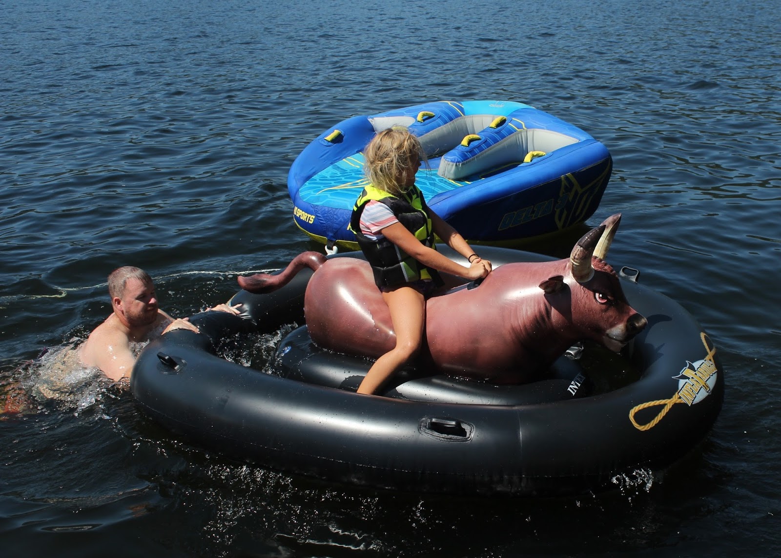 Alex had to leave that afternoon, but we were lucky to get a special delivery a couple hours before he left, and Dan got it blown up right away. This bull was great fun for the kids - and some of the grownups :)
